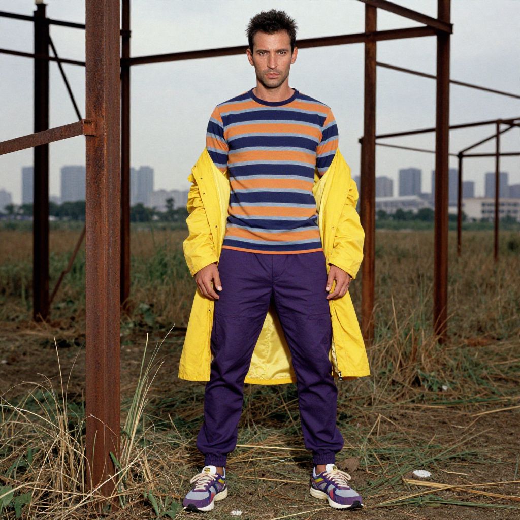 A man, striped long-sleeve tee in bold colors, tailored jogger pants in deep purple, retro-inspired running shoes, lightweight anorak in bright yellow, rusting metal structures, overgrown grass, distant city skyline, lithographic film style, confident expression. Man has masculine face and piercing eyes