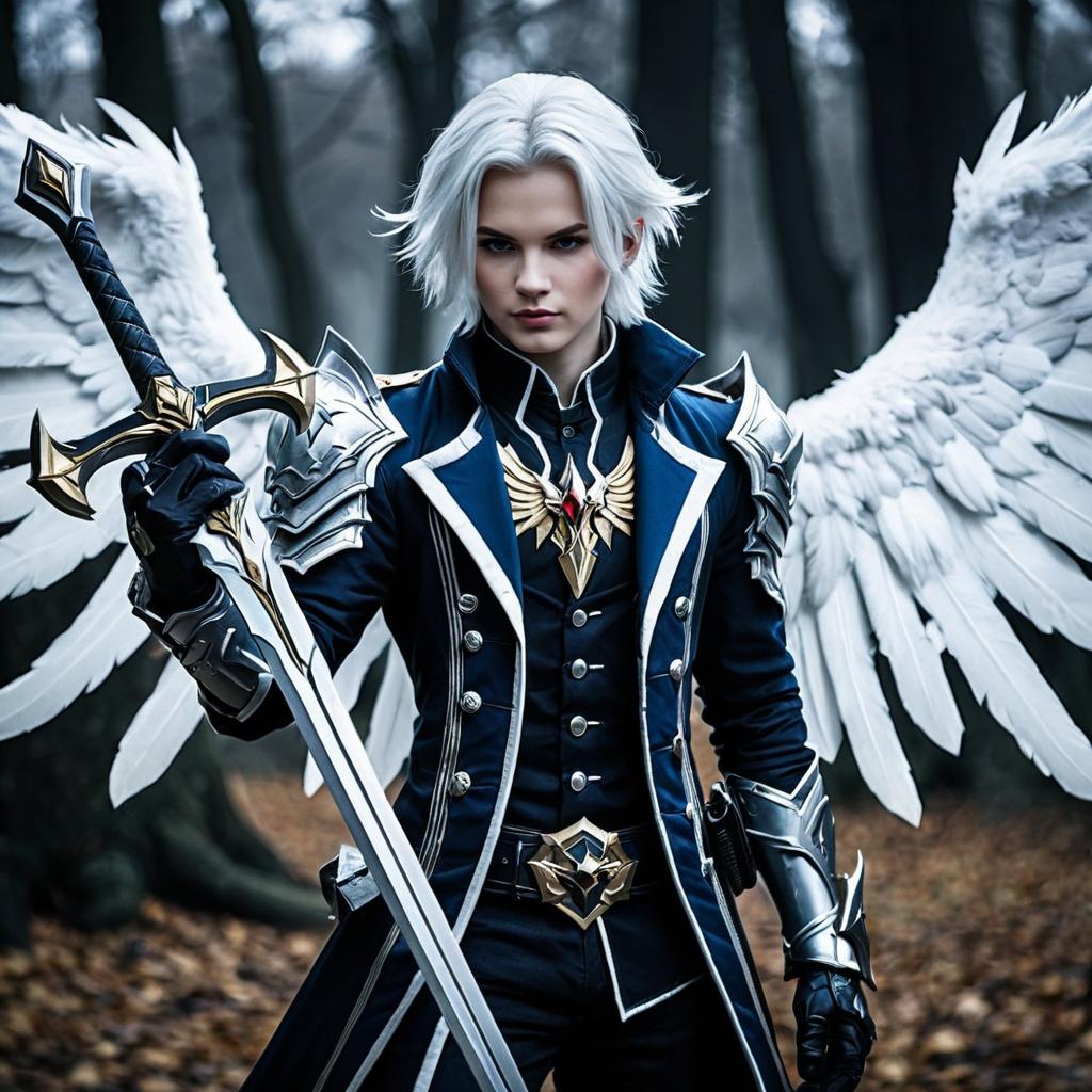 A digital fantasy artwork features a white-haired, pale-skinned, androgynous angelic warrior with striking blue eyes. They have large, detailed white wings and wear a black, ornate military-style coat adorned with gold and silver accents. In their right hand, they hold a gleaming, intricate sword. The background is a dark, blurred forest with fallen leaves on the ground. The warrior's expression is intense and focused. The image has a high-contrast, dramatic style, emphasizing the character's ethereal and powerful presence. The overall color palette is dark with striking white and gold highlights.