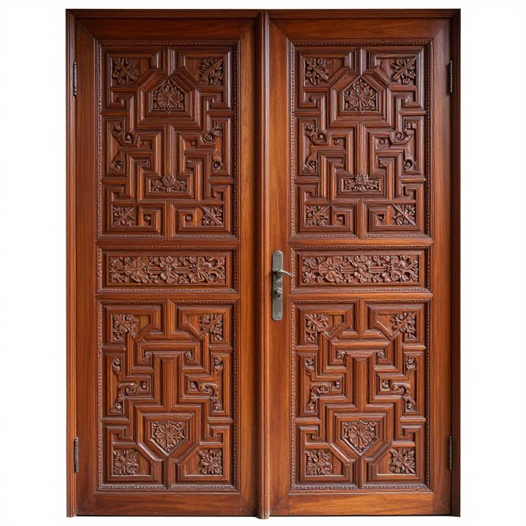 Pair of intricately hand-carved 19th-century teak wood double doors showcasing symmetrical geometric patterns and floral motifs, featuring ornate detailing and polished craftsmanship.
