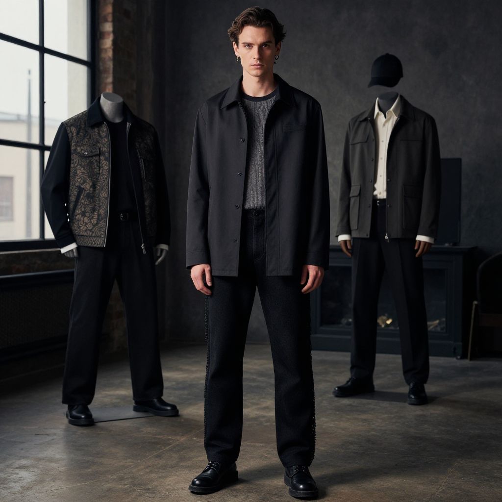 Modern Fringe fit European man, fashion editorial shoot, urban loft background, curated modern attire, dramatic lighting, 2024 menswear trends, 4k detail, professional photography