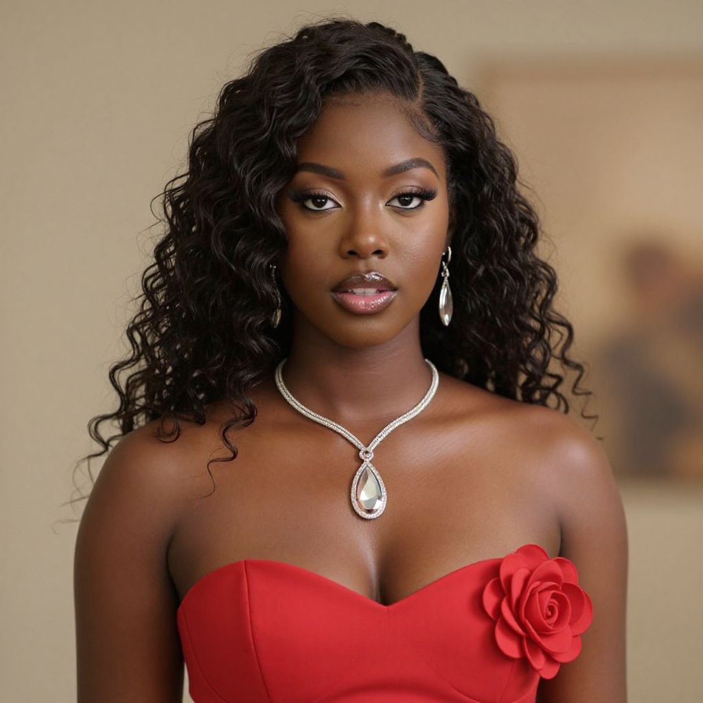"glitter dance costume, 1girl, solo, jewelry, breasts, dark-skinned female, dark skin, cleavage, black hair, earrings, long hair, headdress, dress Realistic photo of casual sexy person with pretty face"