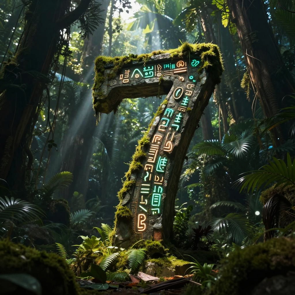 A17 ancient artifact discovered in a mysterious jungle temple, covered in glowing runes and moss, ethereal light beams piercing through dense foliage, exploration theme with a mix of fantasy and sci-fi elements, richly textured and atmospheric