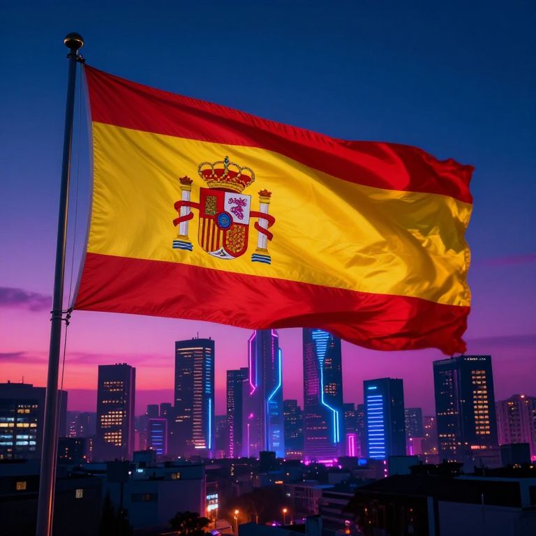 Photograph of Spanish flag with yellow and red stripes, royal coat of arms, waving against a vibrant, neon-lit city skyline at dusk.