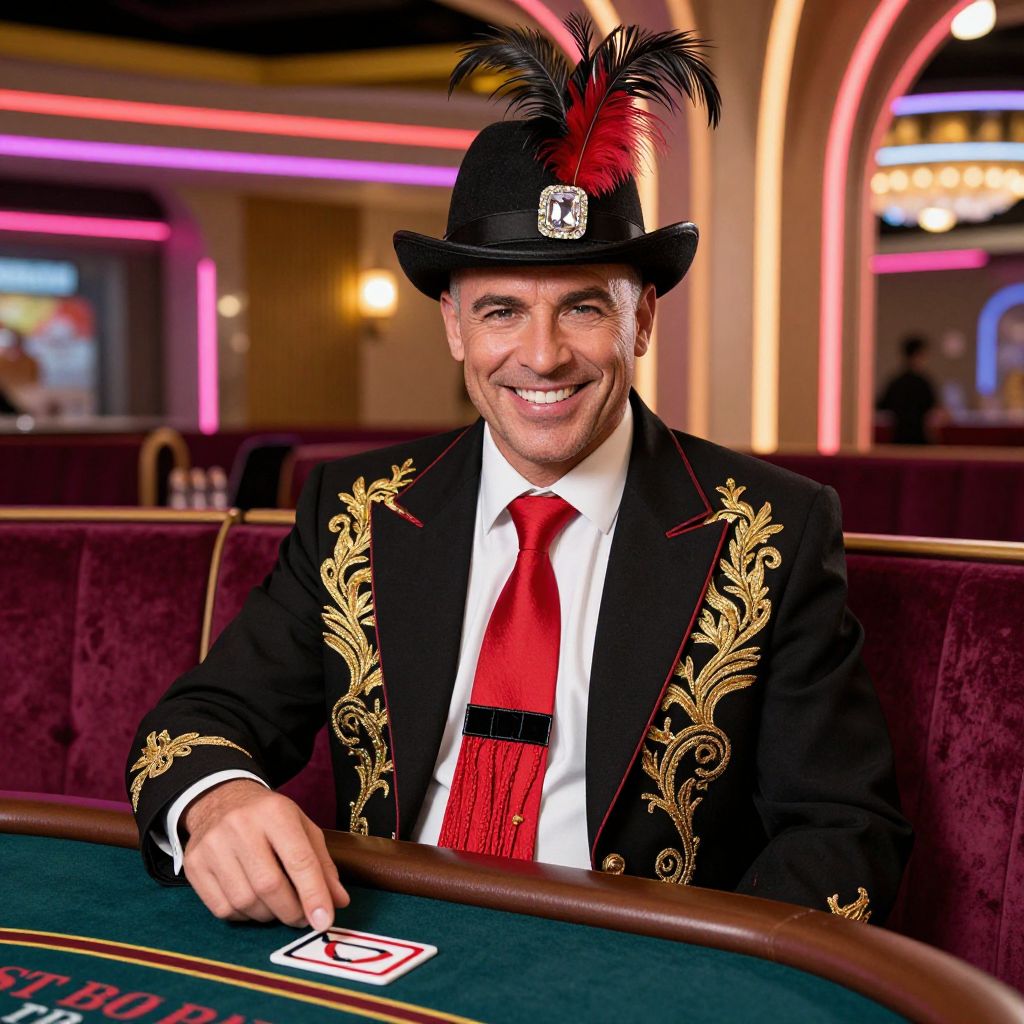 Photograph of a smiling middle-aged man with light skin, wearing a black formal suit adorned with gold embroidery, a white shirt, and a vibrant red tie. He also sports a black top hat with a red and black feather. He is seated at a green casino table, with his right hand resting on the edge. The background features dim lighting, pink neon accents, and blurred casino elements. His attire and hat evoke a vintage, magician-like style. The table has a visible poker chip and a rectangular chip with a white "5".