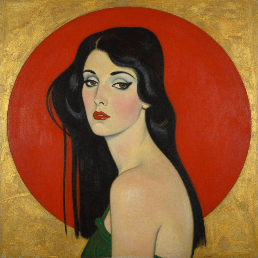 A vibrant Art Deco-style painting featuring a woman with cascading black hair, set against a bold red circular backdrop on a textured gold background, evoking the elegant and stylized aesthetic reminiscent of Tamara de Lempicka's work.