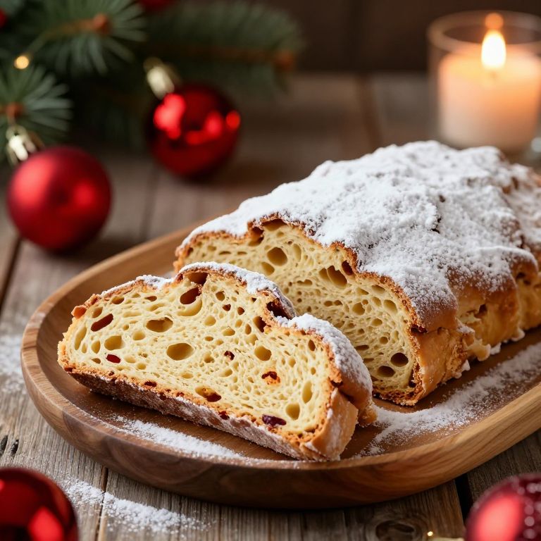 Golden slices of freshly baked stollen, dusted with powdered sugar, rest invitingly on a wooden plate, surrounded by festive red ornaments and warm candlelight, creating a cozy Christmas ambiance.