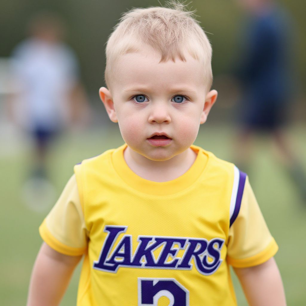 Infant lakers outfit, solo, male focus, 1boy, looking at viewer, blurry background, realistic, shirt, soccer uniform, blurry, sportswear, blue eyes, outdoors