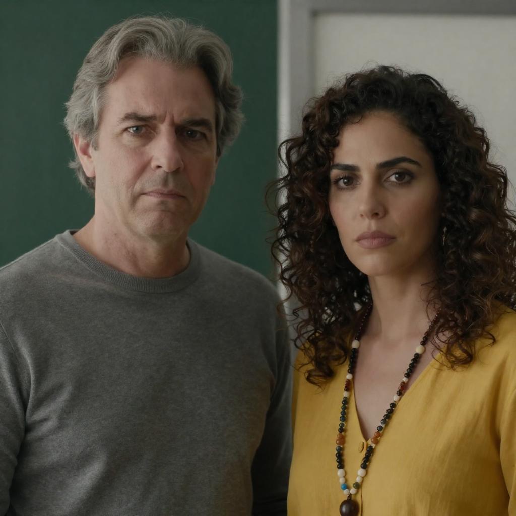 Photograph of a woman with dark, wavy hair and a red sweater, hugging a young boy with brown hair. They sit on a red leather couch in a dimly lit room. An unseen person's hand pulls luggage handles in the foreground. The woman's expression is worried, the boy's expression is anxious.