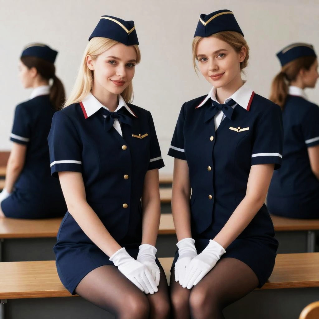 Multiple girls, 2girls, stewardess, dark blue uniform, garrison cap, pantyhose, white gloves, realistic, blonde, pale skin, mature female, Russian, looking at viewer, seductive smile, (masterpiece