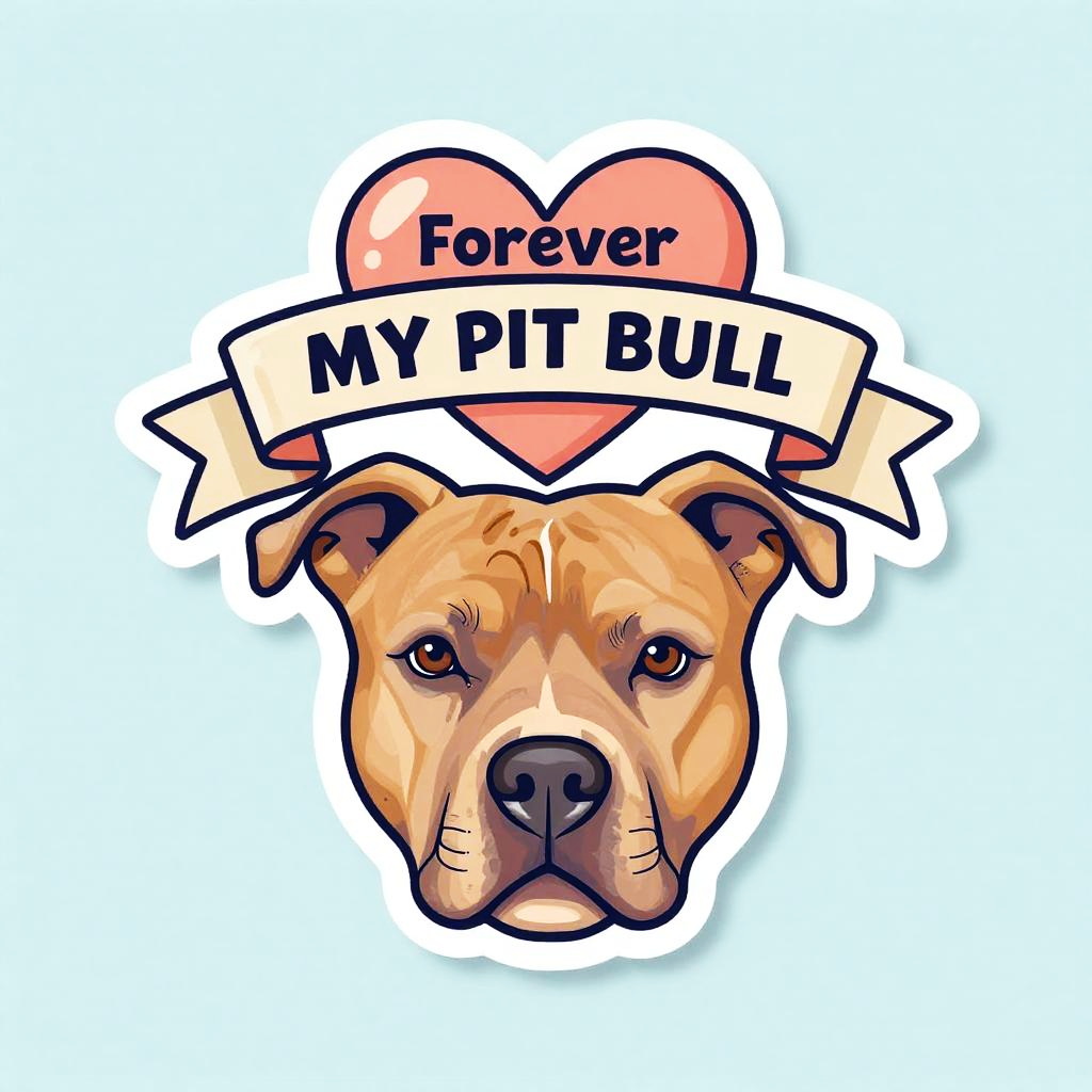 Sticker design with a Forever My Pit Bull theme, featuring a heart with banner ribbon and a pit bull head with soulful eyes illustration, colorful and warm, pastel blue background