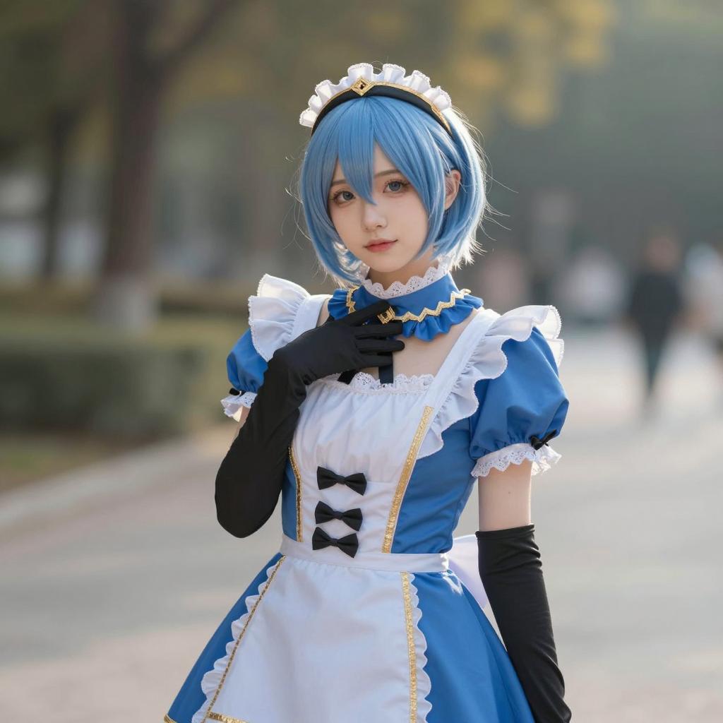 Photo-realistic portrait of a young Asian woman with short blue hair wearing an elaborate dark blue Alice costume inspired by the game SinoAlice. The outfit includes gold trim, ruffled puff sleeves, a high collar, a white apron with black bows, and elbow-length black gloves. The photo is taken outdoors with natural lighting and a soft blurred background featuring warm tones.
