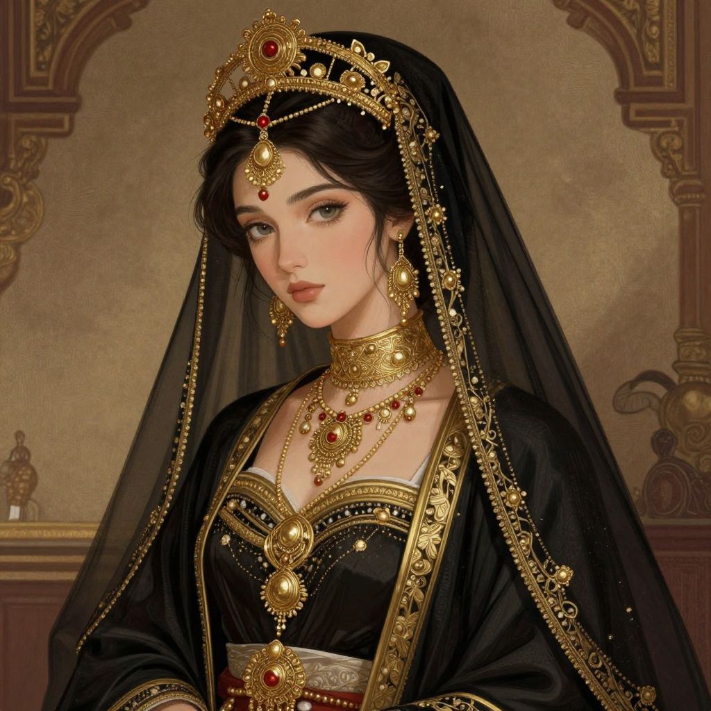 A richly detailed digital illustration inspired by F. Fasce's portrayal of harem life, featuring an elegantly adorned woman in traditional attire, with intricate gold jewelry and a flowing black veil set against a warm, vintage-inspired backdrop.