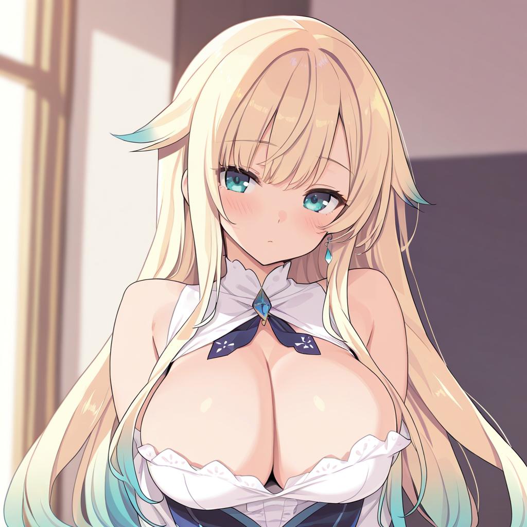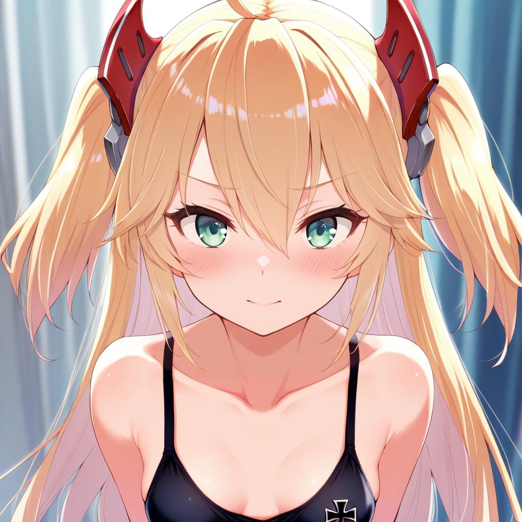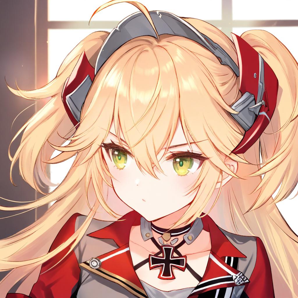 Admiral hipper (azur lane), azur lane, 1girl, green eyes, hair between eyes, mole under eye, blonde hair, long hair, two side up, ahoge, sidelocks, small breasts, collarbone, iron cross, headgear, by artist hato haru, illustrious