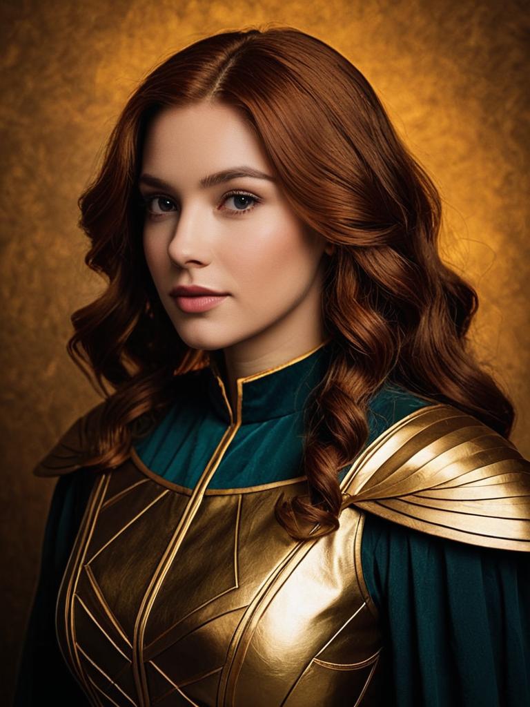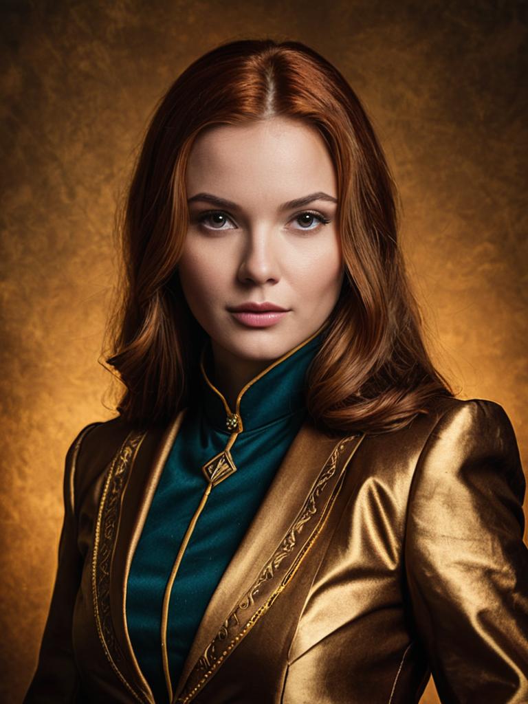 Portrait of a woman with long red hair wearing a detailed Flay Allster cosplay costume featuring dark teal velvet with gold metallic accents and structured shoulder pieces. The costume includes a high collar with a gemstone brooch, set against a warm, textured background.