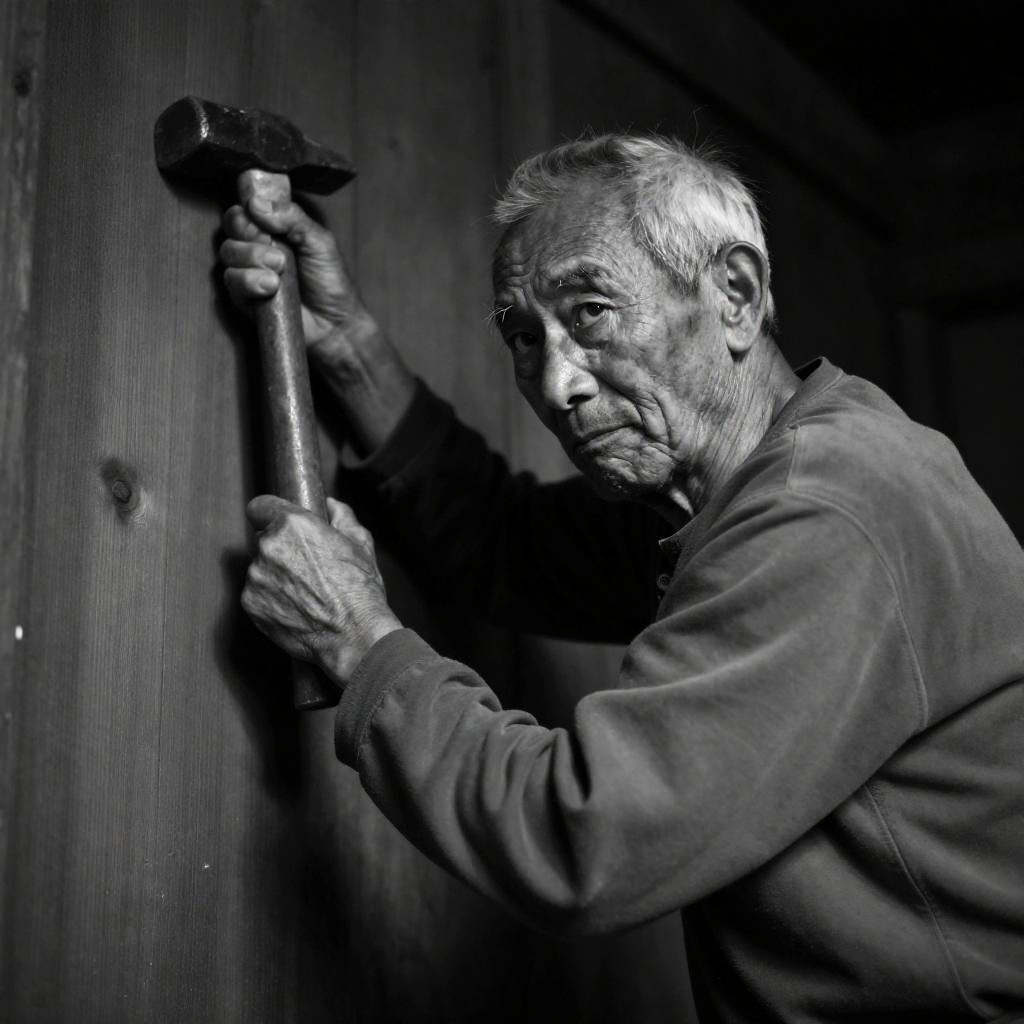 Old man with gray hair in white shirt and black pants sits on floor, weaving. Young boy in striped shirt and shorts stretches out, holding weaving thread. Dimly lit, wooden room, sunlight casts shadows. Boy looks focused, man smiles gently.
