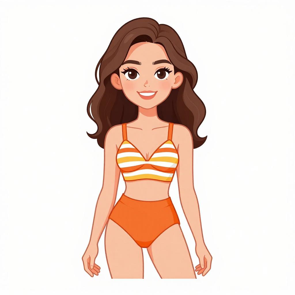 Woman with pretty face and pretty hair. smiling Woman, beachwear style, two-piece swimsuit with high-waisted bottom in solid burnt orange, coordinating bandeau top featuring horizontal stripes in white, orange, and shades of yellow with thin shoulder straps, white studio background --sref 1467