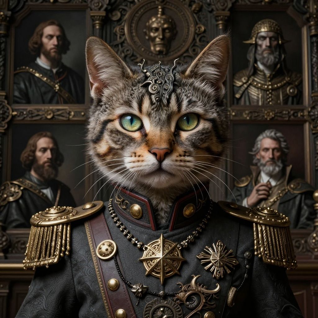 Full body portrait of french cat, queen dress, piercing eyes, chaos design, blue and red fractal, multiples layers, hyper detailed, hyperrealism, high detail, high quality, high resolution, dramatically captivating, perfect composition, beautiful detailed intricate insanely detailed octane render, trending on artstation, 8K, artistic, concept art, soft natural volumetric cinematic perfect light, chiaroscuro, award - winning, masterpiece, raphael, caravaggio, greg rutkowski, beeple, beksinski, giger, detailed background