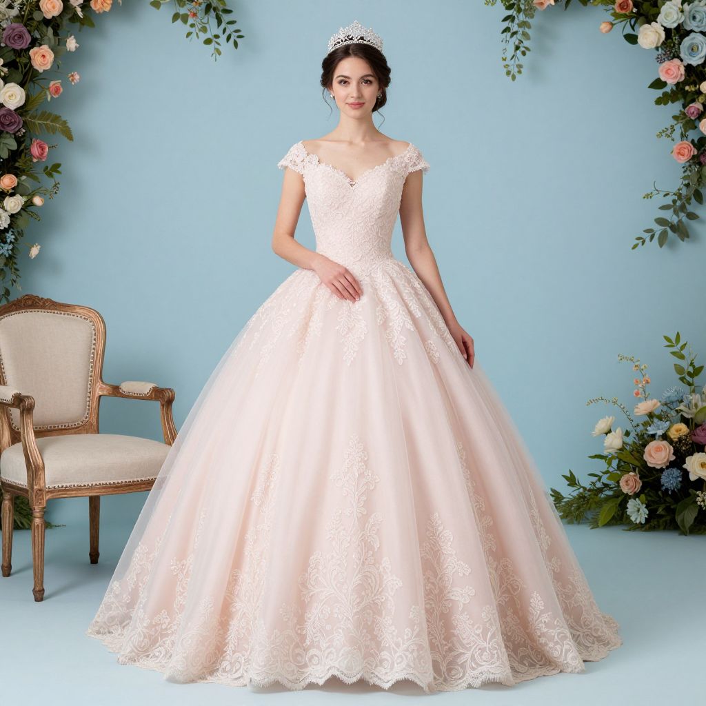 Elegant princess ball gown in soft pink, featuring lace detailing and a silver tiara, gracefully worn by a woman standing against a pastel blue backdrop adorned with floral accents and a vintage chair to the left.