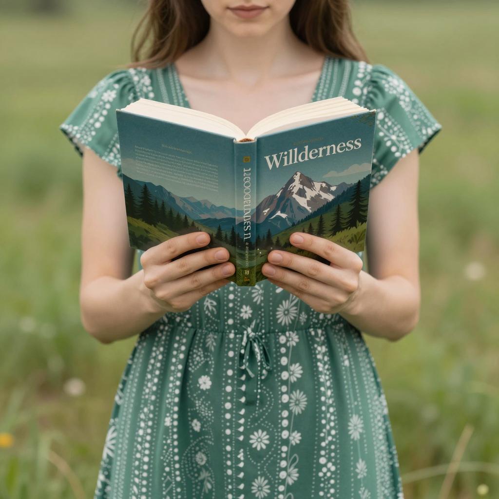 Woman with light skin and brown hair in a green dress with white patterns holds an open book titled "Wilderness." Her hands grip the book in front of her. Grass background. Book cover shows a mountain and forest scene. She is standing.