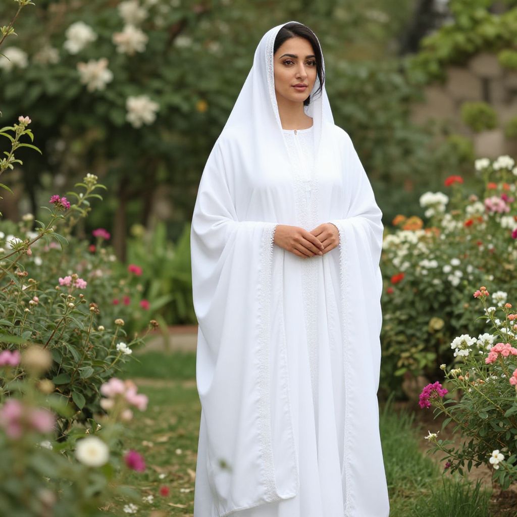Elegant woman wearing a pristine white burqa standing in a lush garden with blooming flowers, soft natural light, vibrant colors, delicate embroidery visible, cinematic style