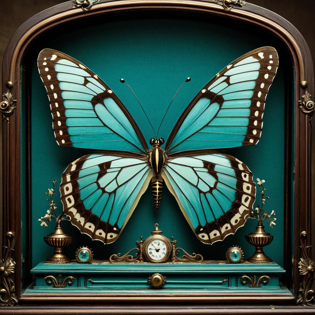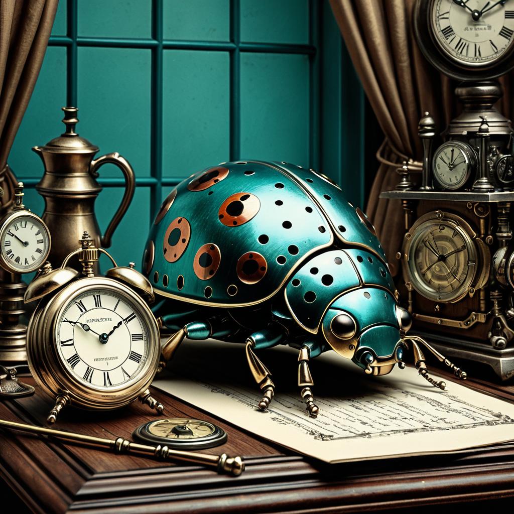 Onyx clockwork hummingbird in a modernist novella of a painter and an interplanetary trader rendered with trompe-lœil illusionistic detail, clockpunk accents, familiar domestic scenes and lively tableaus in the style of Evgeni Gordiets and Joe Jusko, tinted in soft sage green and saffron contrasts.