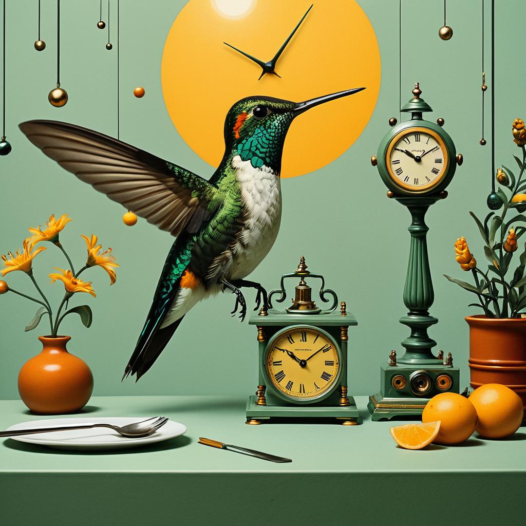 A surreal still life composition featuring a detailed onyx clockwork hummingbird hovering near two vintage green and yellow clocks on a sage green table. The scene includes orange flowers in vases, hanging spherical ornaments, slices of orange citrus fruit, and is tinted in soft sage green with saffron yellow contrasts. The style merges trompe-lœil illusionistic detail and clockpunk elements, evoking a modernist, whimsical aesthetic.
