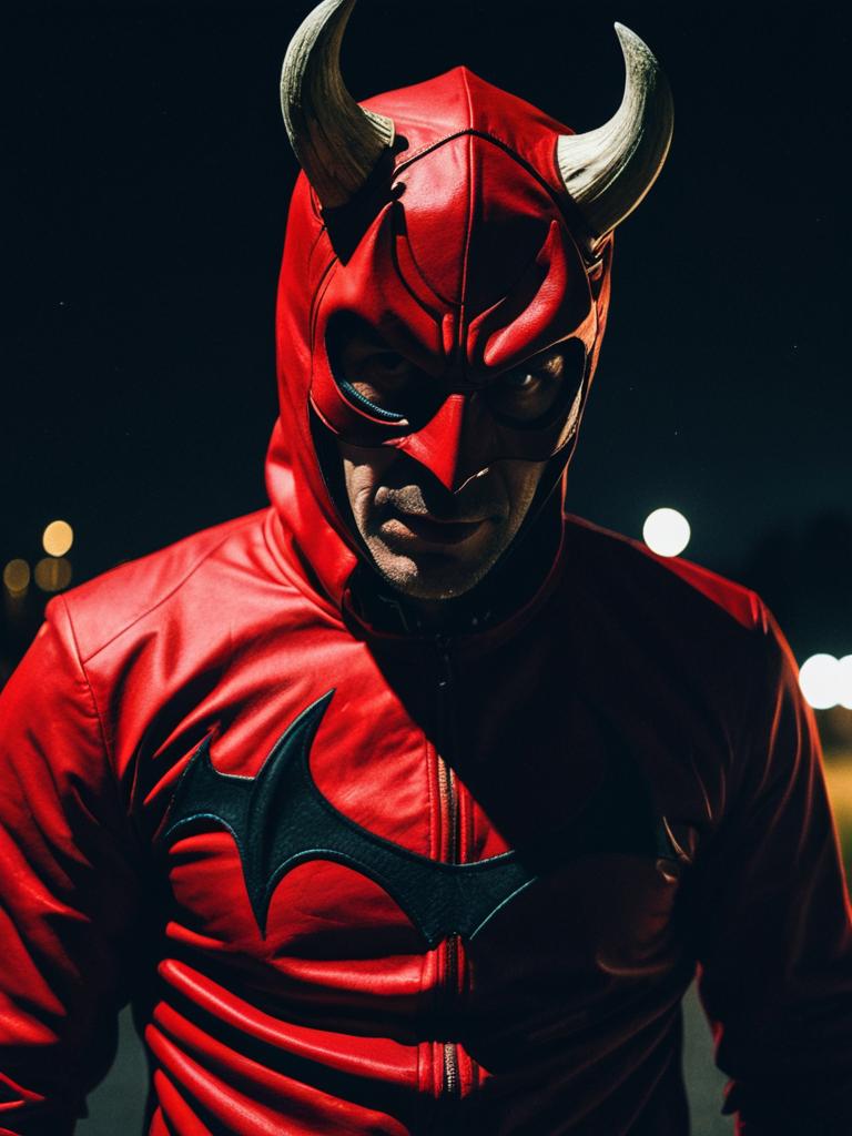 Photorealistic outdoor portrait of a man wearing a red devil costume with a leather-like mask featuring horns and black eye accents. The man is dressed in a matching red jacket decorated with a devil emblem, captured at night with blurred city lights in the background.
