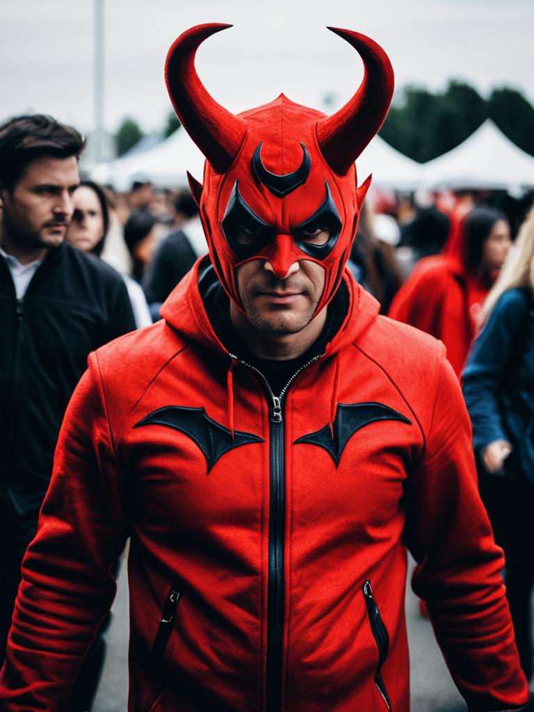 Man in Red Devil Costume, photorealistic outdoor portrait at night