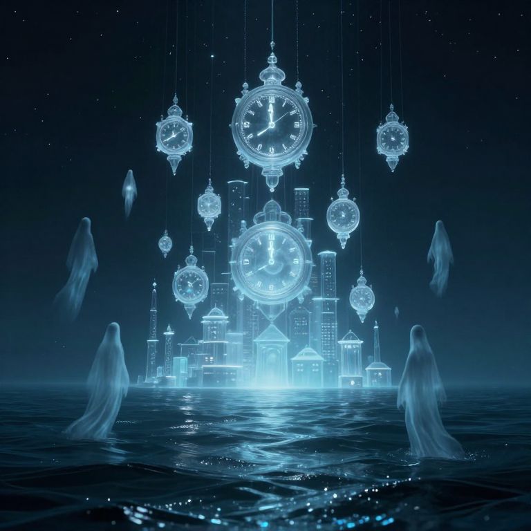 Under an ethereal ocean bathed in liquid starlight, a surreal city of translucent glass clocks ticks backward, their luminous faces suspended above ghostly figures who drift like memories through the reversed currents, evoking a haunting blend of digital artistry and dreamlike fantasy.