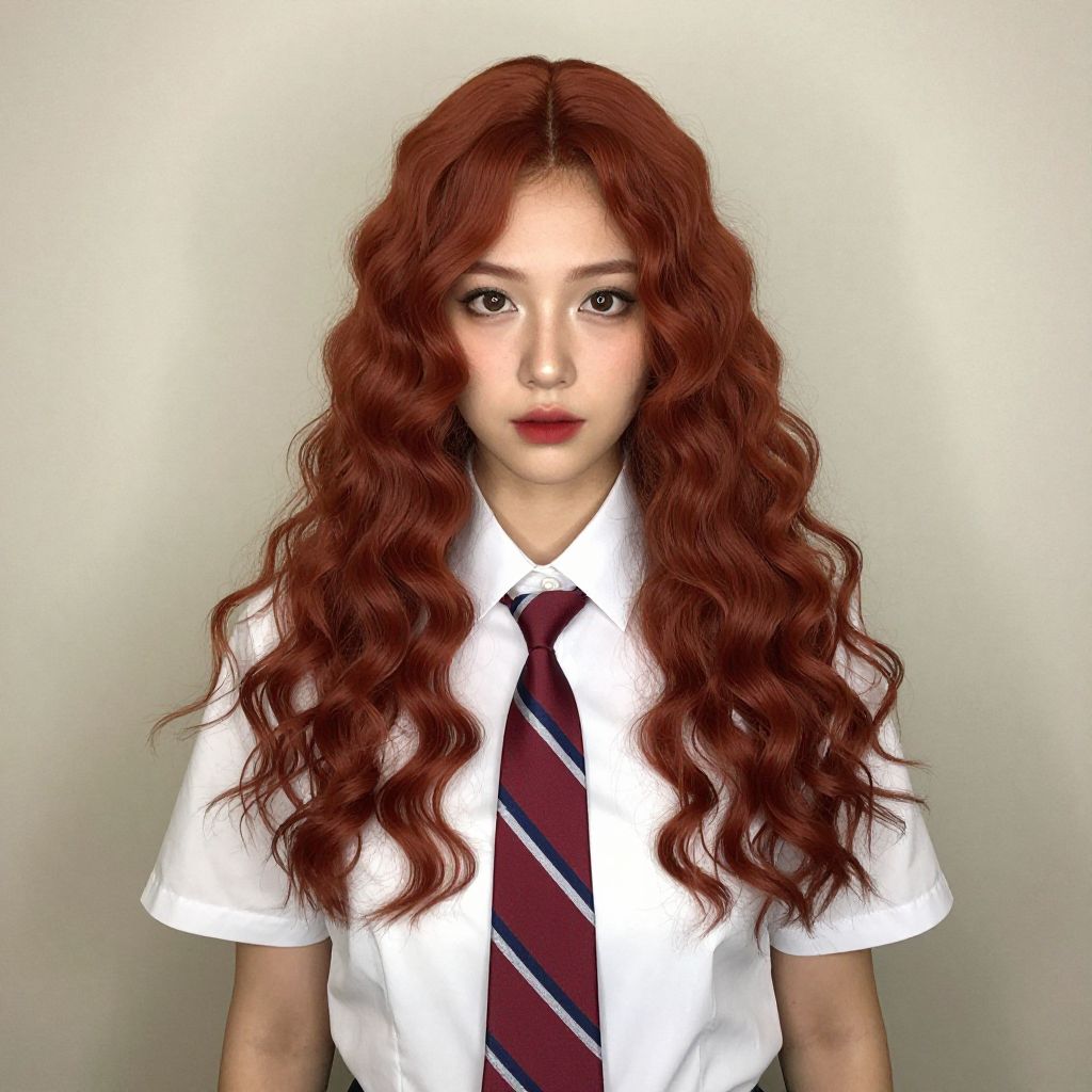Red Curly Wig Costume, woman with red hair and a tie posing for a picture