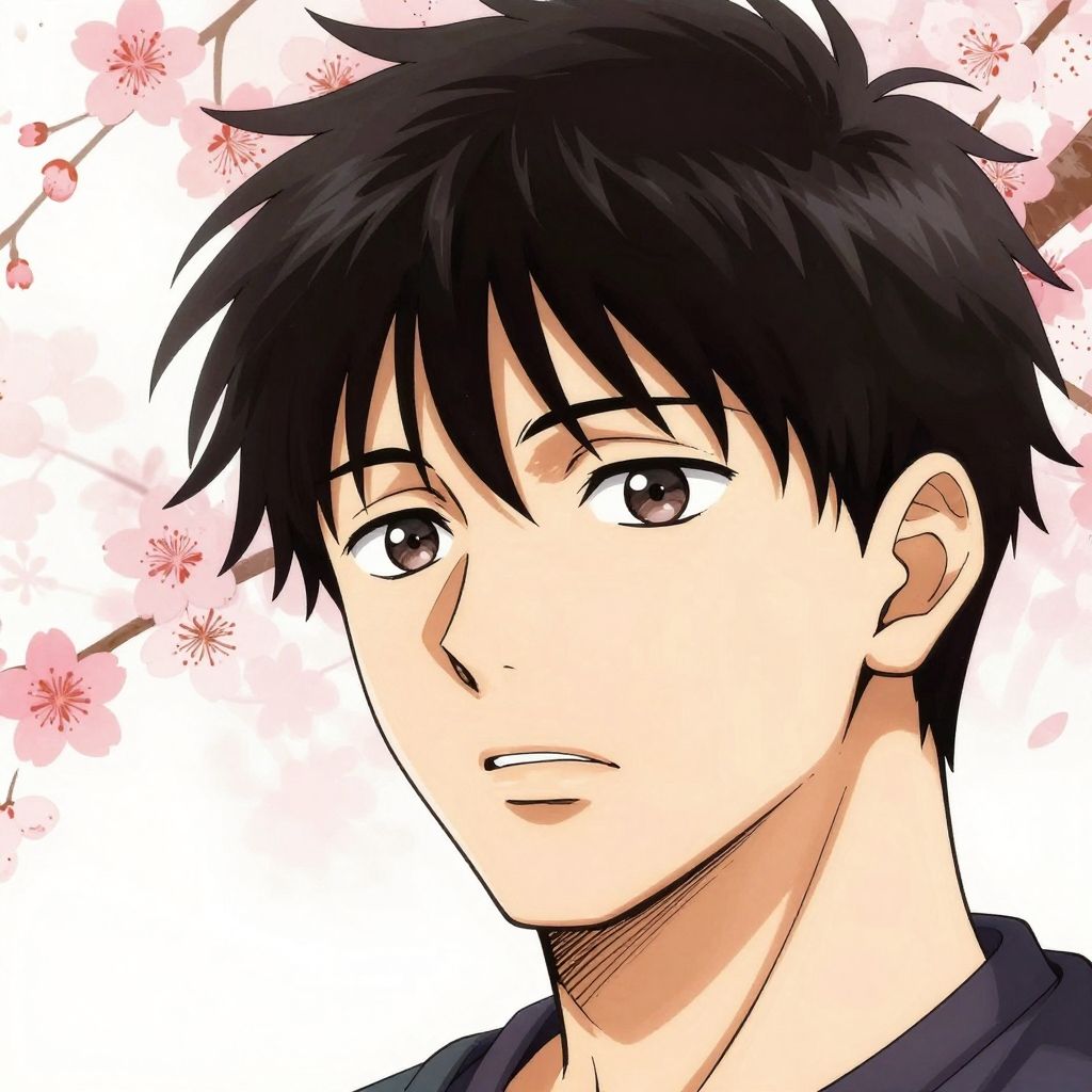 Anime-style digital drawing of a young man with black, tousled hair, blue eyes, and a neutral expression, wearing a dark suit and white shirt