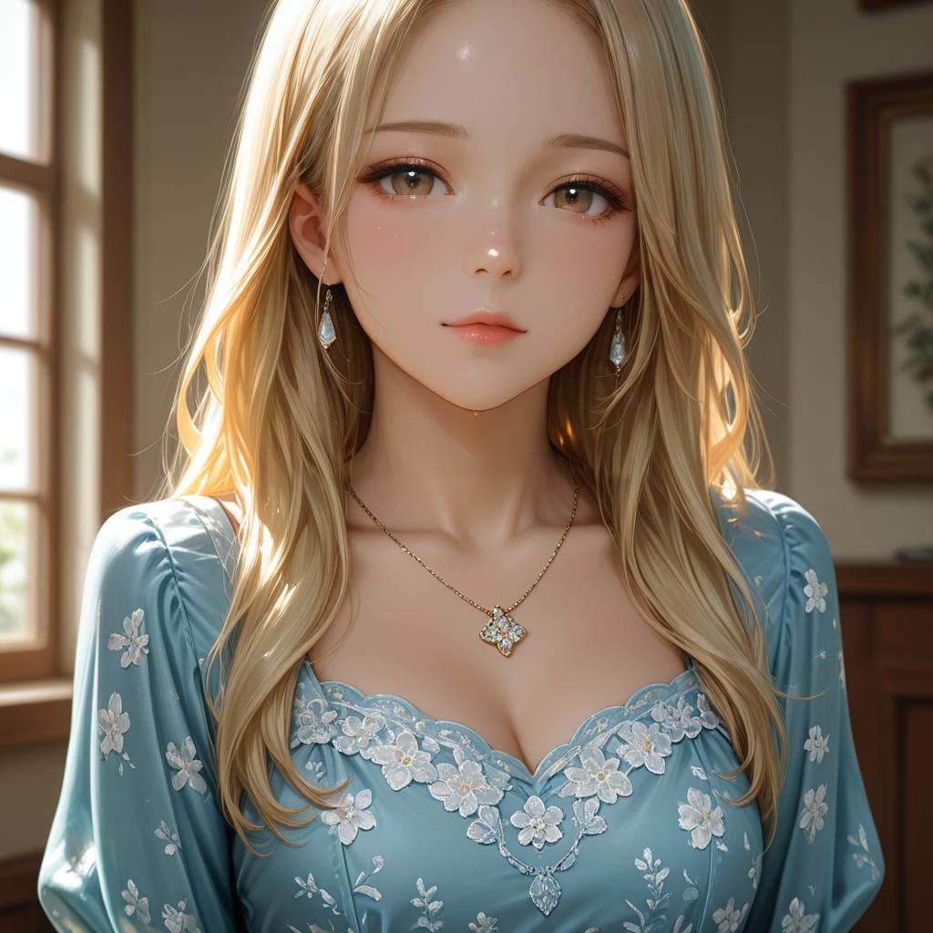 Photorealistic image of a young blonde woman with long hair wearing a blue dress with white floral embroidery. She has brown eyes, is wearing a delicate pendant necklace and matching earrings, and stands indoors near a window with soft light illuminating her face. The background is softly blurred, emphasizing depth of field.