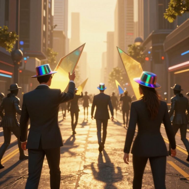 In a cyberpunk-inspired 3D-rendered cityscape bathed in golden-hour lighting, citizens clad in sleek suits and wearing iridescent, reflective hats march purposefully down a sunlit street, utilizing giant prisms to manipulate light in a surreal, ongoing battle against shadowy adversaries.