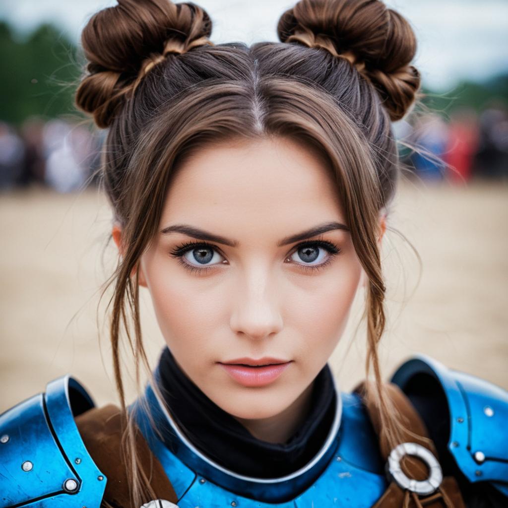 Close-up portrait of a young woman with blue eyes and brown hair styled in double buns, wearing detailed blue armor. The background is blurred, emphasizing the subject's intense gaze and cosplay outfit.