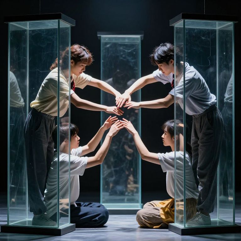Photograph of four Asian individuals in white shirts and black pants, reaching hands through glass boxes, forming a square shape. Bright, focused lighting. Dark