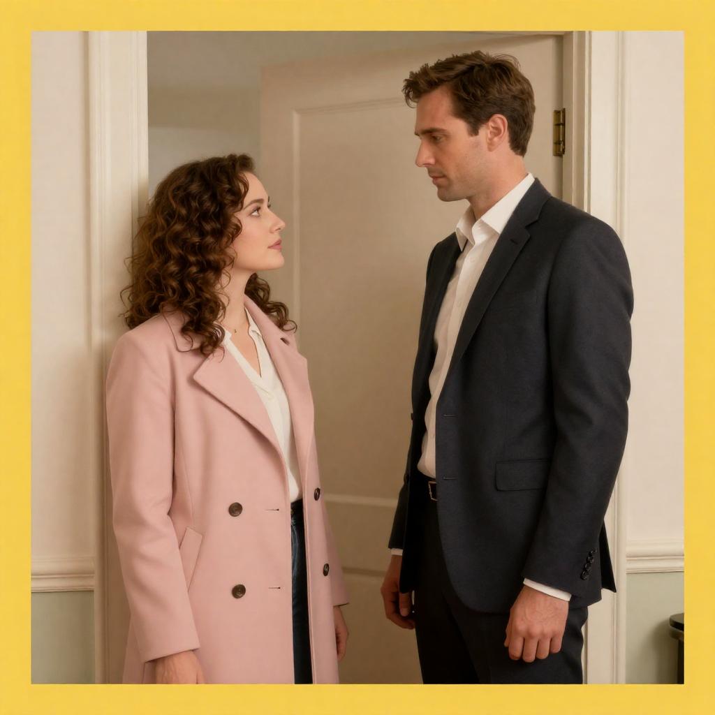 Photograph of a movie poster. A woman in a pink coat with curly brown hair stands on the left, looking up at a man in a dark suit with short brown hair standing in a doorway on the right. The woman has a calm expression, while the man looks serious. The background is a plain wall with a door. The poster has a yellow border.
