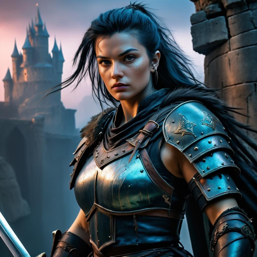 Close-up portrait of a fierce woman warrior wearing detailed medieval-style armor with shoulder plates and leather straps. She has dark hair tied back and a serious expression. The background features a battle-scarred stone castle with turrets, under cinematic moody lighting and a serene color palette, evoking a fantasy medieval atmosphere.