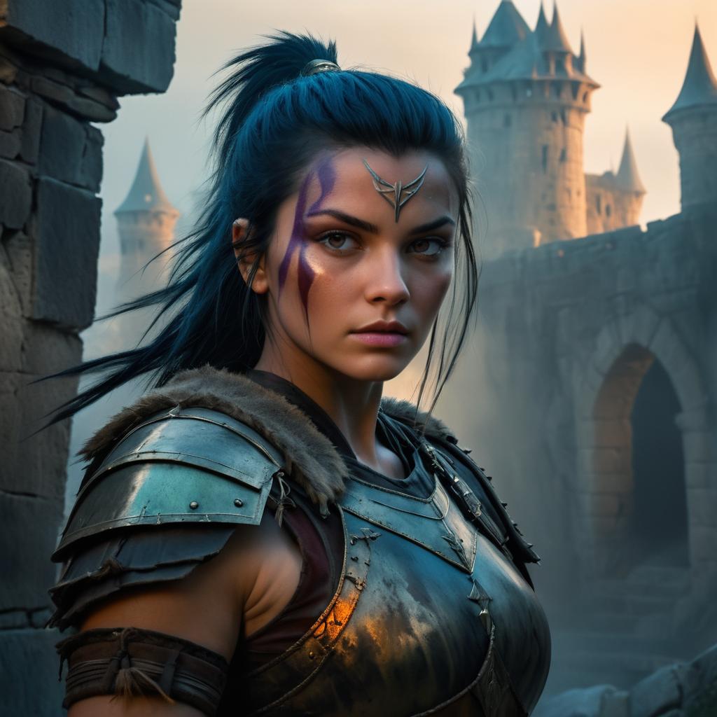 Close-up portrait of a fierce warrior woman in a battle-scarred castle with serene colors, cinematic lighting, and a moody atmosphere, inspired by Frank Frazetta, Julie Bell.