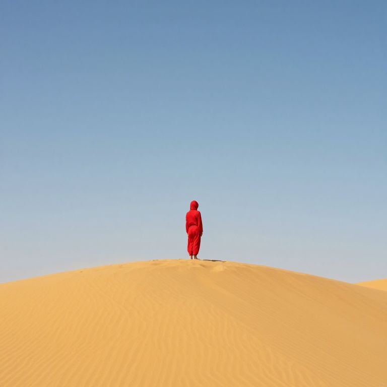 Photograph of a solitary figure in a bright red robe standing on a golden sand dune under a clear, vivid blue sky. The person is centered, facing away from the camera, with a slight upward slope to the dune creating a sense of depth. The sand has a smooth texture, and the contrast between the red robe and the yellow sand is striking. The minimalist composition emphasizes solitude and tranquility. The sky is cloudless, enhancing the clarity and simplicity of the scene.