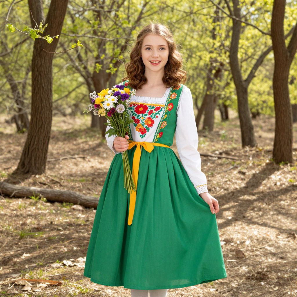 A girl with fair skin, wavy chestnut hair, and a cheerful smile poses in a rustic forest clearing, dressed in a colorful green spring costume featuring a full skirt and a floral embroidered top, the sunlight filtering through the trees as she holds a bouquet of blooming flowers, capturing the essence of a spring festival.
