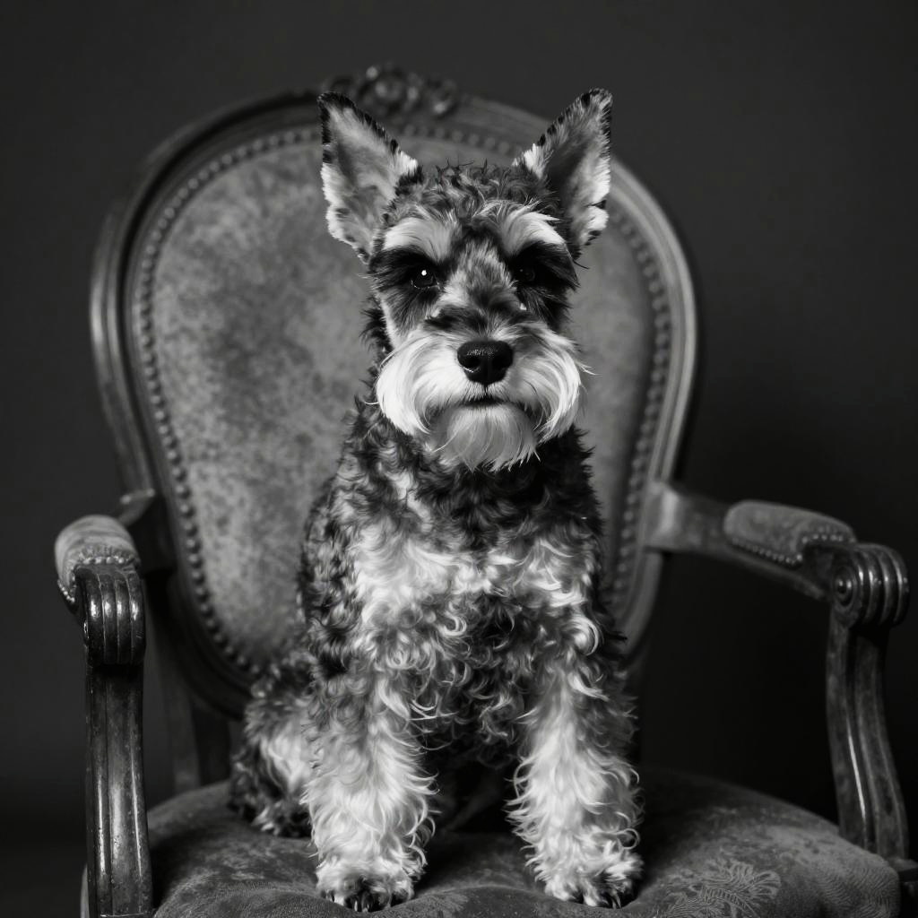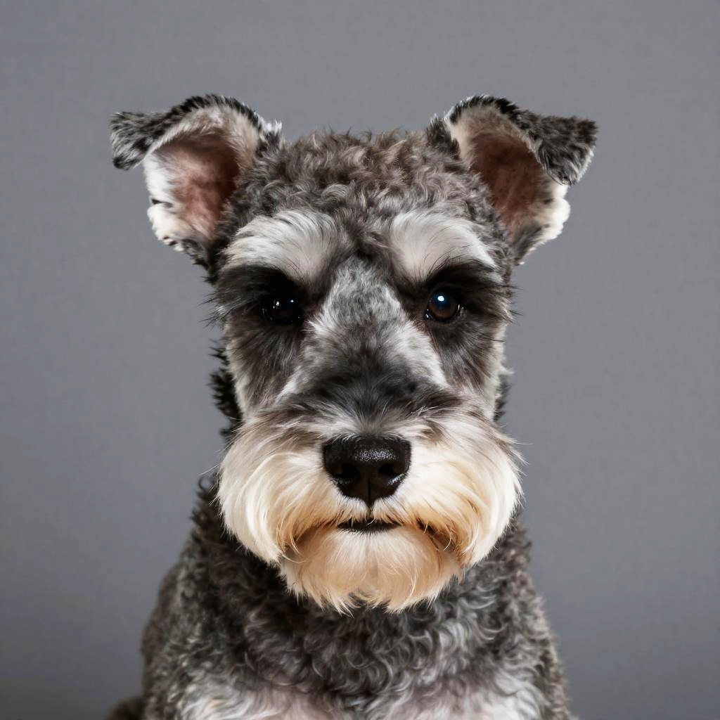 Schnauzer bald head, surreal art of a schnauzer dog with a perfectly bald head, futuristic cyberpunk elements, neon colors, intricate details, glowing eyes