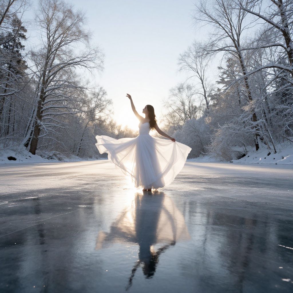 Ethereal sunlight bathes a woman in a flowing white gown as she gracefully stands on a frozen lake, her silhouette mirrored perfectly in the icy water beneath, surrounded by snow-covered trees and a serene winter landscape.