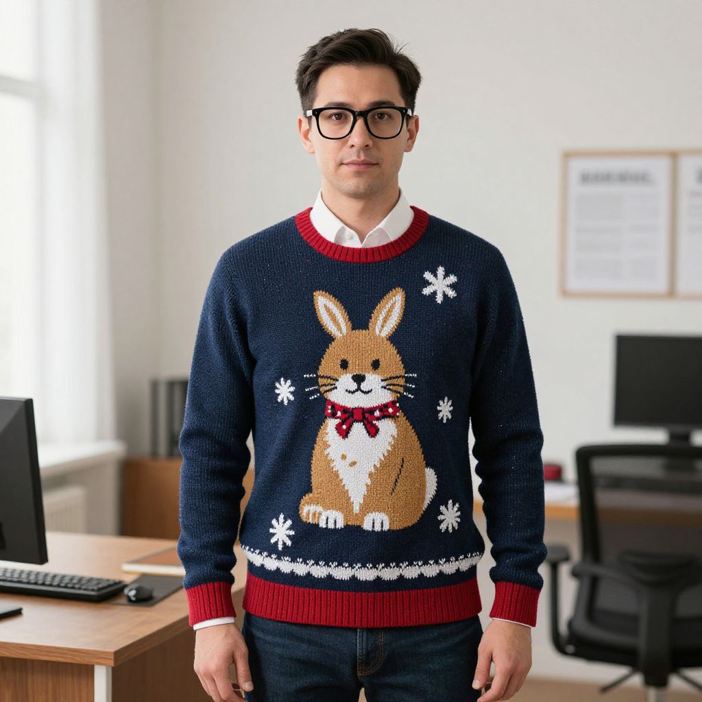Photograph of a fair-skinned man with short, dark hair and black-framed glasses, standing in a bright office. He wears a navy blue knit sweater with a large, cute cartoon brown and white rabbit wearing a red ribbon, surrounded by white snowflakes, and red cuffs. Underneath, he has a white dress shirt. The background shows a window on the left, a wooden desk with a computer monitor and keyboard on the left, and a black office chair on the right. A framed document hangs on the white wall in the background. The man stands centered in the image.