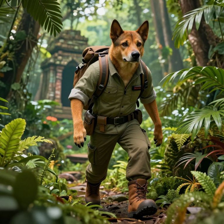 Dog humanoid explorer trekking through a dense jungle, wearing rugged adventurer outfit with utility belt and boots, canine face with sharp eyes and ears, tropical plants and ancient ruins in background, vibrant colors and dynamic lighting, concept art with fine detail.