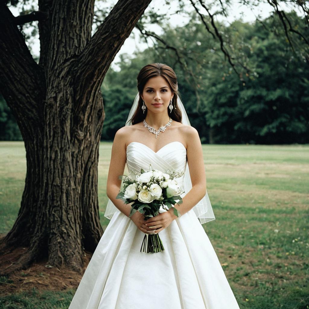 A young bride with brown hair and brown eyes stands outdoors on green grass next to a leafy tree. She wears an elegant white off-shoulder wedding dress with embroidery details, a bridal veil, and a tiara. She holds a bouquet of white flowers and accessorizes with earrings and a delicate necklace.