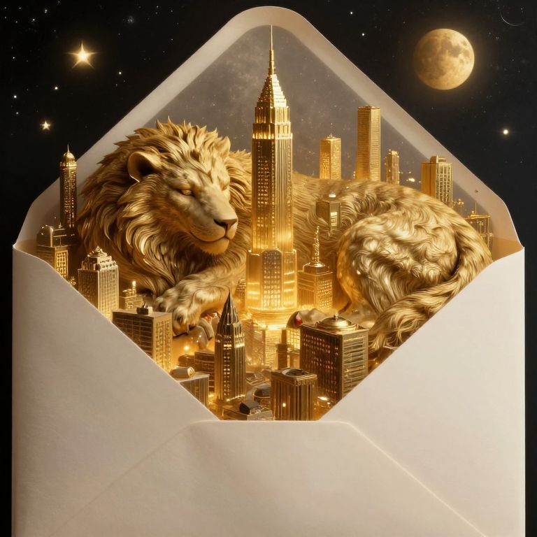 A digital illustration features two golden lion sculptures with realistic fur textures, lounging atop a detailed, illuminated cityscape of skyscrapers inside an open white envelope. The cityscape includes a prominent, golden-tinted Empire State Building. The background is a starry night sky with a full moon and scattered stars. The envelope's crisp edges contrast with the intricate, glowing cityscape inside, blending fantasy with realism. The lions' relaxed expressions and detailed fur add a sense of calm and majesty to the urban scene. The overall style is surreal and imaginative, merging urban and natural elements in a striking composition.