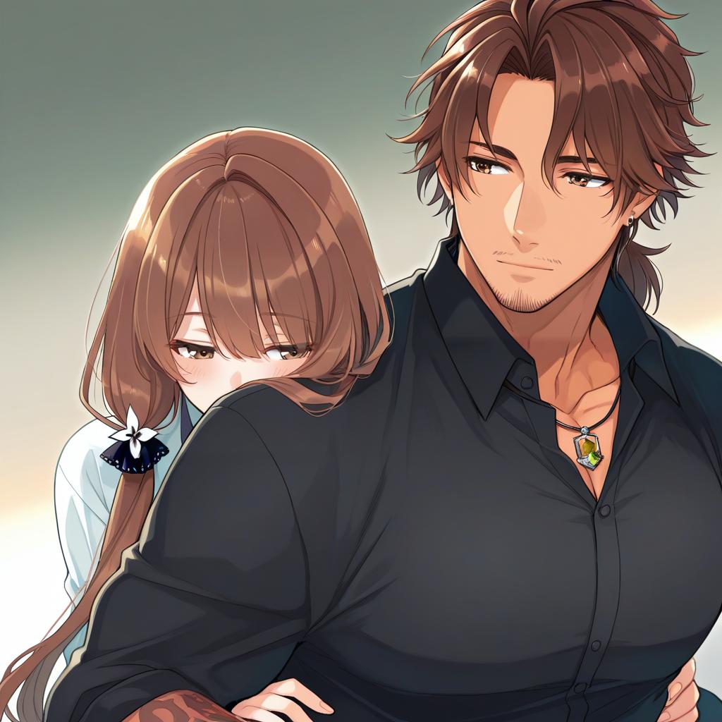 Belmond banderas, nijisanji, 1boy, brown eyes, thick eyebrows, brown hair, long hair, parted bangs, ponytail, low ponytail, collared shirt, black shirt, long sleeves, virtual youtuber, virtual youtuber, stubble, by artist goku suzume, illustrious
