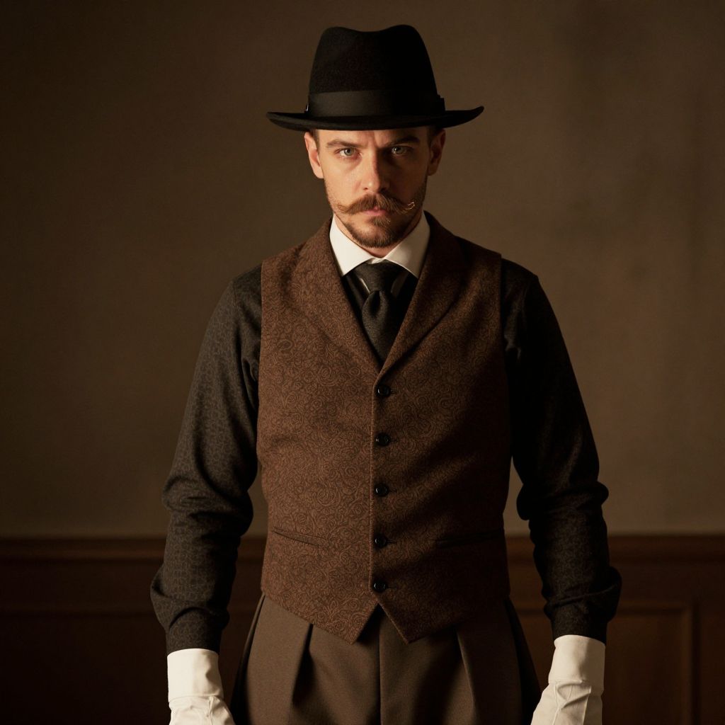 Photograph of a man standing against a dark, textured wall. He wears a black fedora, a dark brown tweed vest over a black dress shirt with white cuffs, and a black tie. His brown trousers match the vest. He has a trimmed beard and mustache, and his expression is serious. The lighting casts shadows, enhancing the vintage, Sherlock Holmes-like aesthetic. The background is blurred, focusing attention on the man's detailed, classic attire. The overall mood is mysterious and timeless.