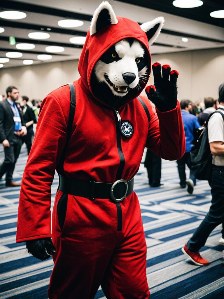 Man in Crimson Paw Costume, candid cosplay portrait at convention