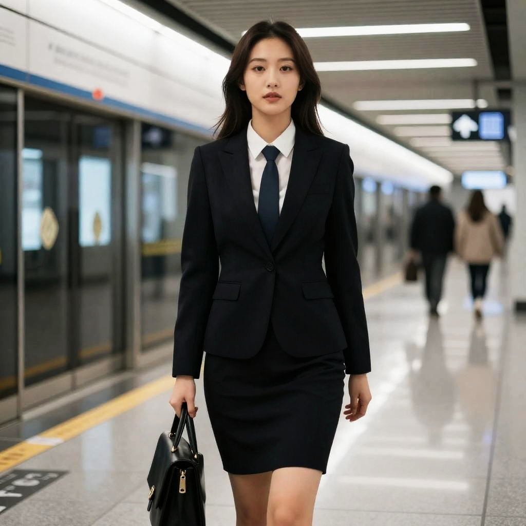 Woman Lawyer Outfit Dress, woman in black suit and tie standing in a subway station --sref 1404